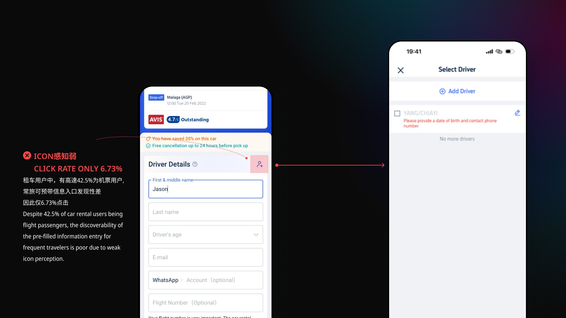 While nearly half of our rental users (42.5%) are flight travelers, the entry point for pre-filled travel info is easily overlooked. The subtle icon design leads to low engagement, resulting in only 6.73% of users interacting with this high-value shortcut.